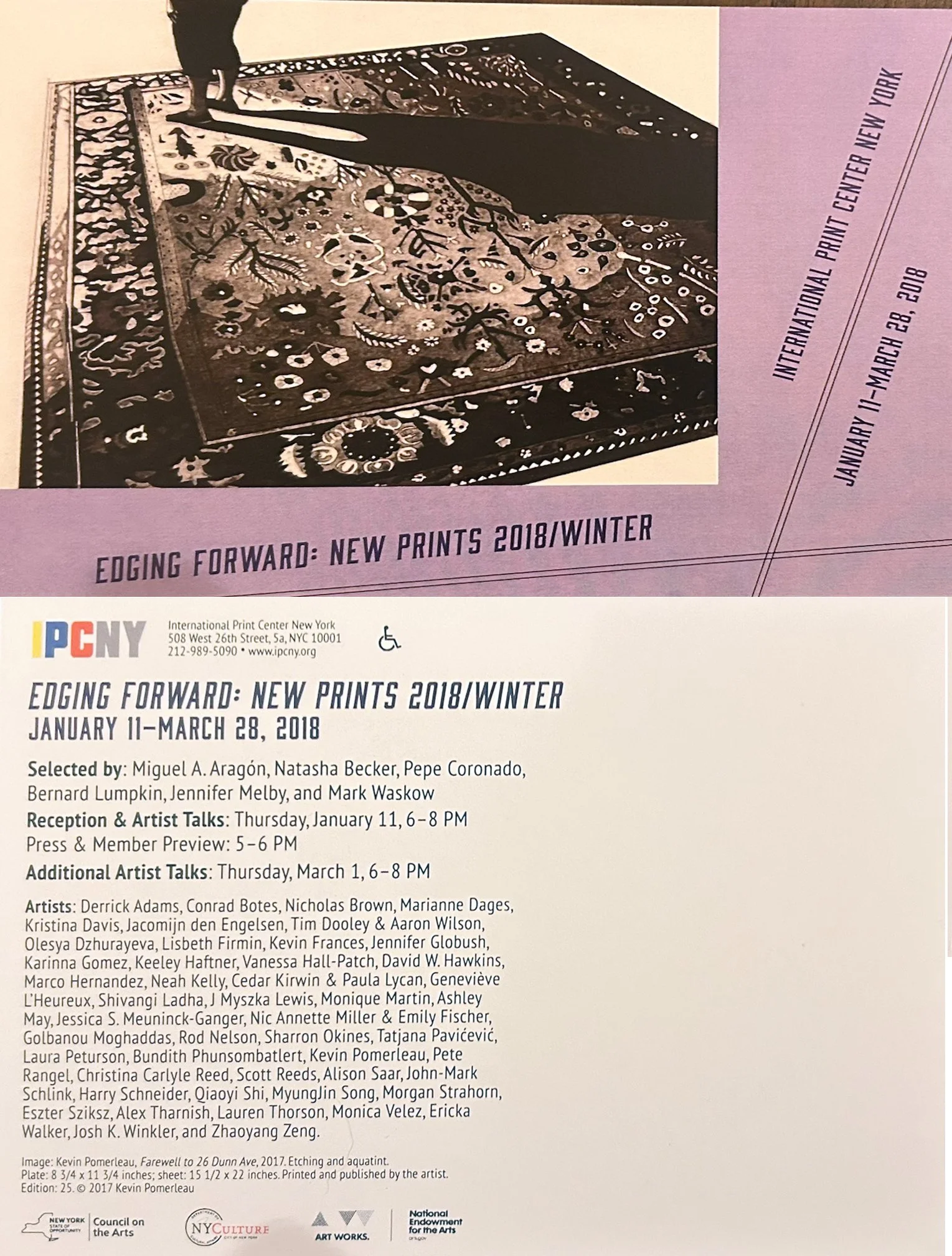 Edging Forward: New Prints 2018/Winter, group exhibition juried by Miguel A. Aragón, Natasha Becker, Coronado, Bernard Lumpkin, Jennifer Melby, and Mark Waskow, International Print Center New York, New York City, NY.