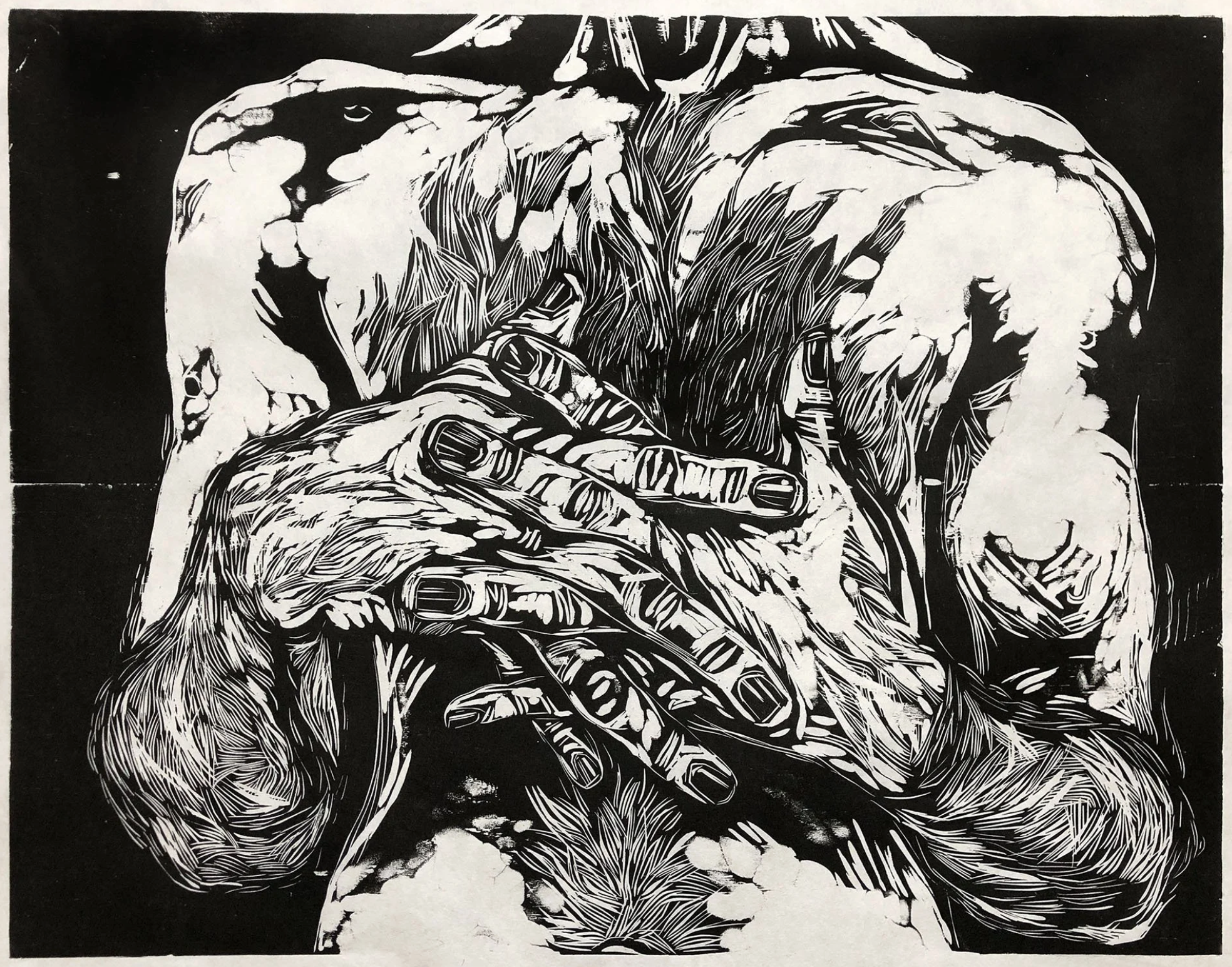Teddy’s work is autobiographical, exploring their relationships with people, places, and objects through the lens of their queer identity. Their artistic practice reflects their journey of 'becoming' queer, drawing from personal experiences of shame, joy, and self-acceptance. In their woodcut, “Getting Ready,” Teddy captures a selfie of the outfit they've chosen for a night out, navigating their self-expression amidst the private space of their apartment and the virtual realm of the mirror. This process allows them to experiment with clothes, makeup, and accessories, embracing the playful, messy journey of self-discovery.